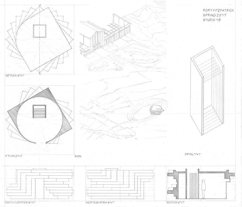 This project is from my first year of school. It is a memorial to students who died in a fire, located near a chapel on Mississippi State’s campus. The project was rendered through hand drafting a plaster study models.